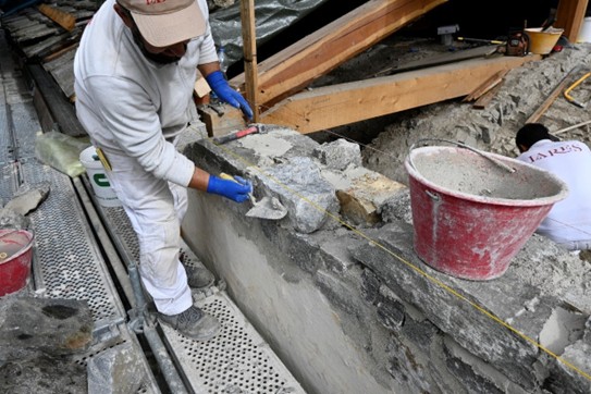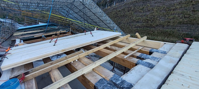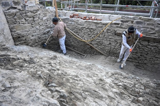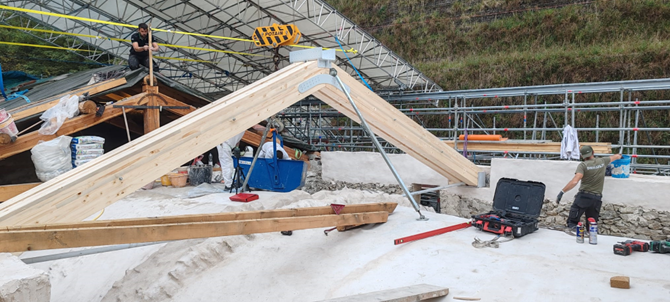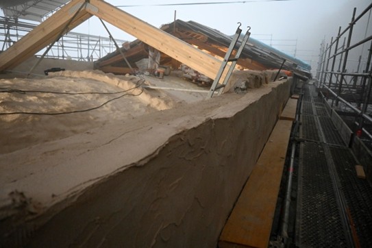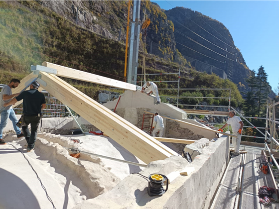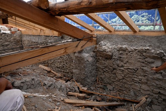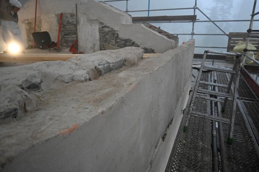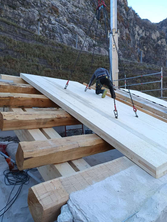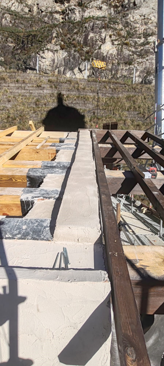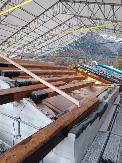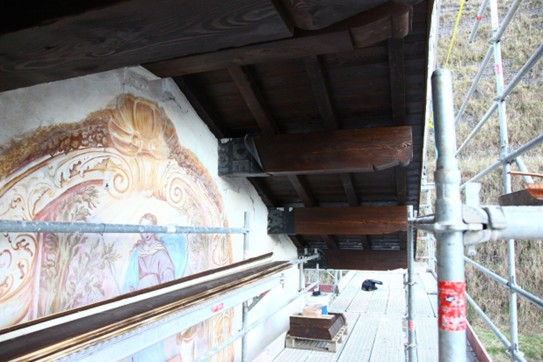 Nel corso dell’ultimo anno, l’impresa incaricata, Lares, ha portato avanti interventi rilevanti sia all’interno sia all’esterno del Santuario. All’interno si è intervenuti sulla volta della navata centrale con operazioni di pulitura e consolidamento di intonaci, stucchi, parti decorate e lignee; particolare attenzione è stata riservata agli affreschi di maggiore pregio, come quelli attribuiti al Caresana, sui quali sono stati eseguiti saggi e verifiche in accordo con la Soprintendenza. All’esterno i lavori hanno riguardato la ricostruzione di porzioni di muratura perimetrale con materiali coerenti con l’impianto originario e la realizzazione della nuova struttura del tetto, con posa di capriate, travi in larice, soletta in legno lamellare e sistemi di protezione e impermeabilizzazione.