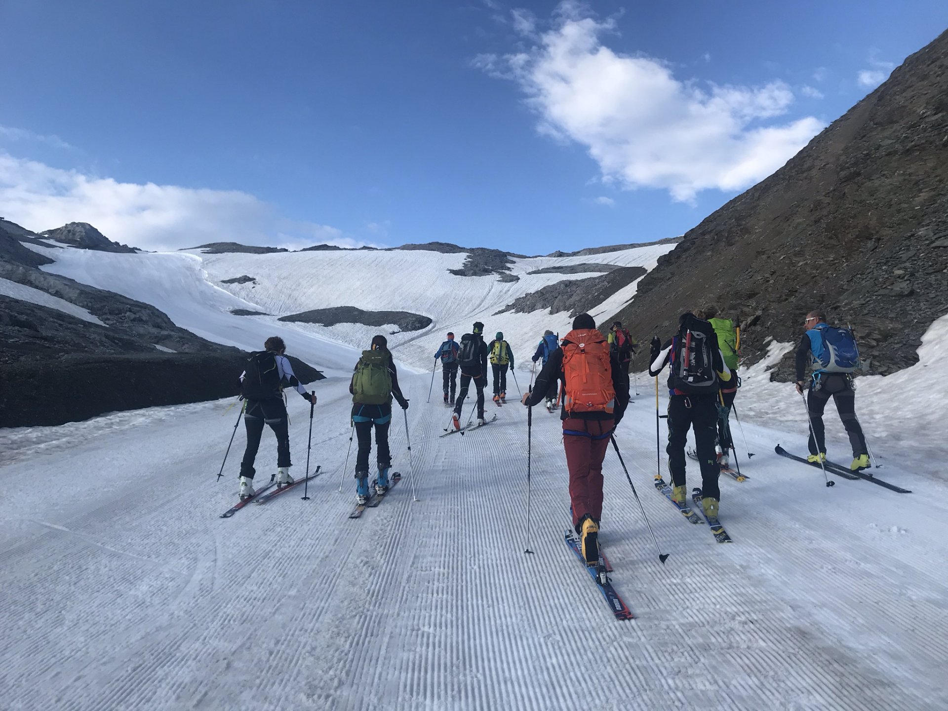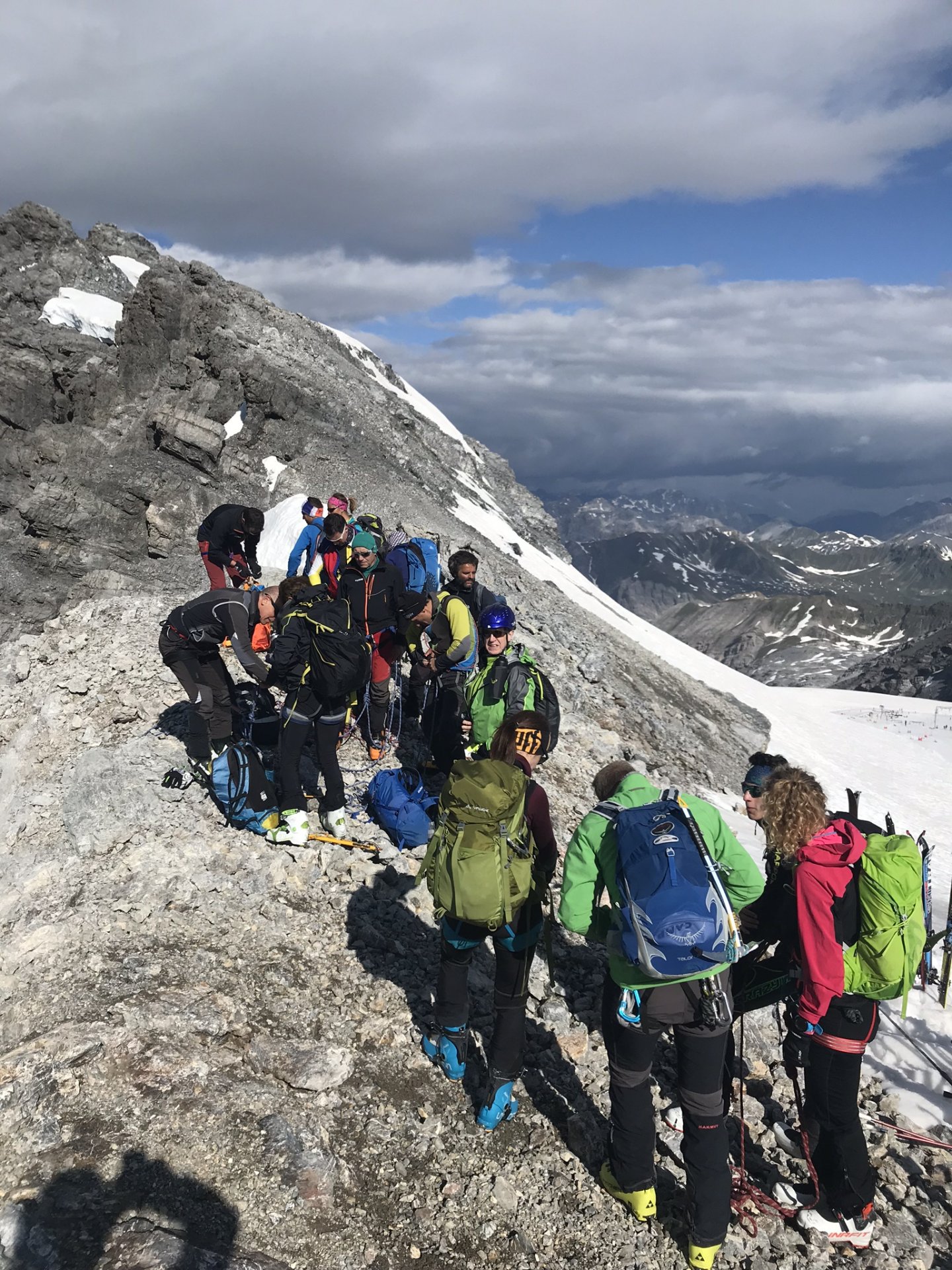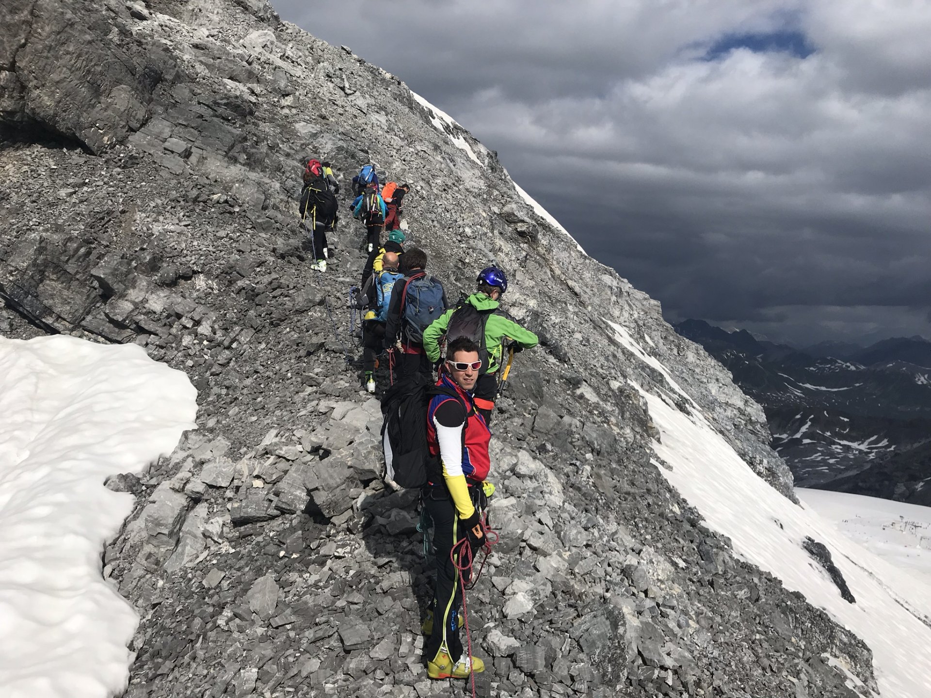 La partenza dalla sede Cai era fissata domenica alle ore 6, con le auto i soci hanno raggiunto il passo dello Stelvio, poi con gli sci e pelli di foca sul ghiacciaio del Livrio fino al Sasso Rotondo. Poi le roccette della cresta in cordata con i ramponi perchè ci sono tratti di neve e ghiaccio. Il meteo che in partenza era buono si è coperto e per 5 minuti è addirittura nevicato, poi di nuovo il sole. Alle 11 comunque tutto il gruppo ha raggiunto la cima del monte Cristallo, metri 3431. La discesa per la stessa via di salita fino al Sasso Rotondo e da lì con gli sci fino al passo dello Stelvio ancora tutto innevato.