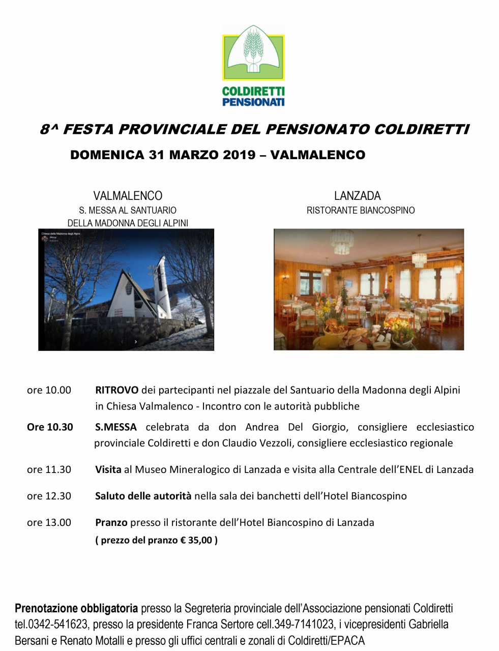 Si svolgerà a Chiesa in Valmalenco e a Lanzada, domenica 31 Marzo, ottava edizione della festa pensionati Coldiretti. Inizio con la Santa Messa nel santuario Madonna degli Alpini in Valmalenco a seguire pranzo sociale.
