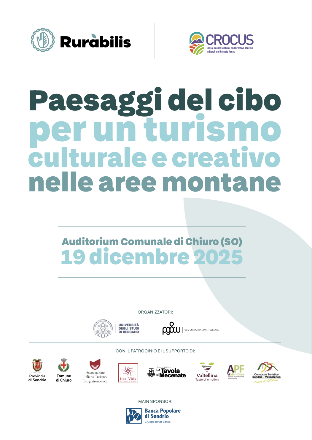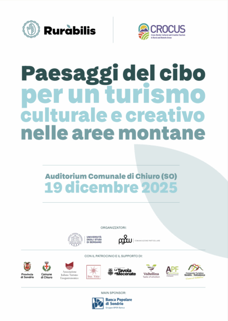 La Valtellina ospita un’importante giornata di studi dedicata a turismo, cultura e valorizzazione dei territori montani. Venerdì 19 dicembre 2025, all’Auditorium Comunale “Valtellinesi nel mondo” di Chiuro (SO), si terrà il seminario “Paesaggi del cibo per un turismo culturale e creativo nelle aree montane”, promosso dal Polo della Valtellina dell’Università degli studi di Bergamo e dalla divisione Cultura e Territorio dell’agenzia PG&W nell’ambito dei progetti Ruràbilis e Crocus – Cross-Border Cultural and Creative Tourism in Rural and Remote Areas.