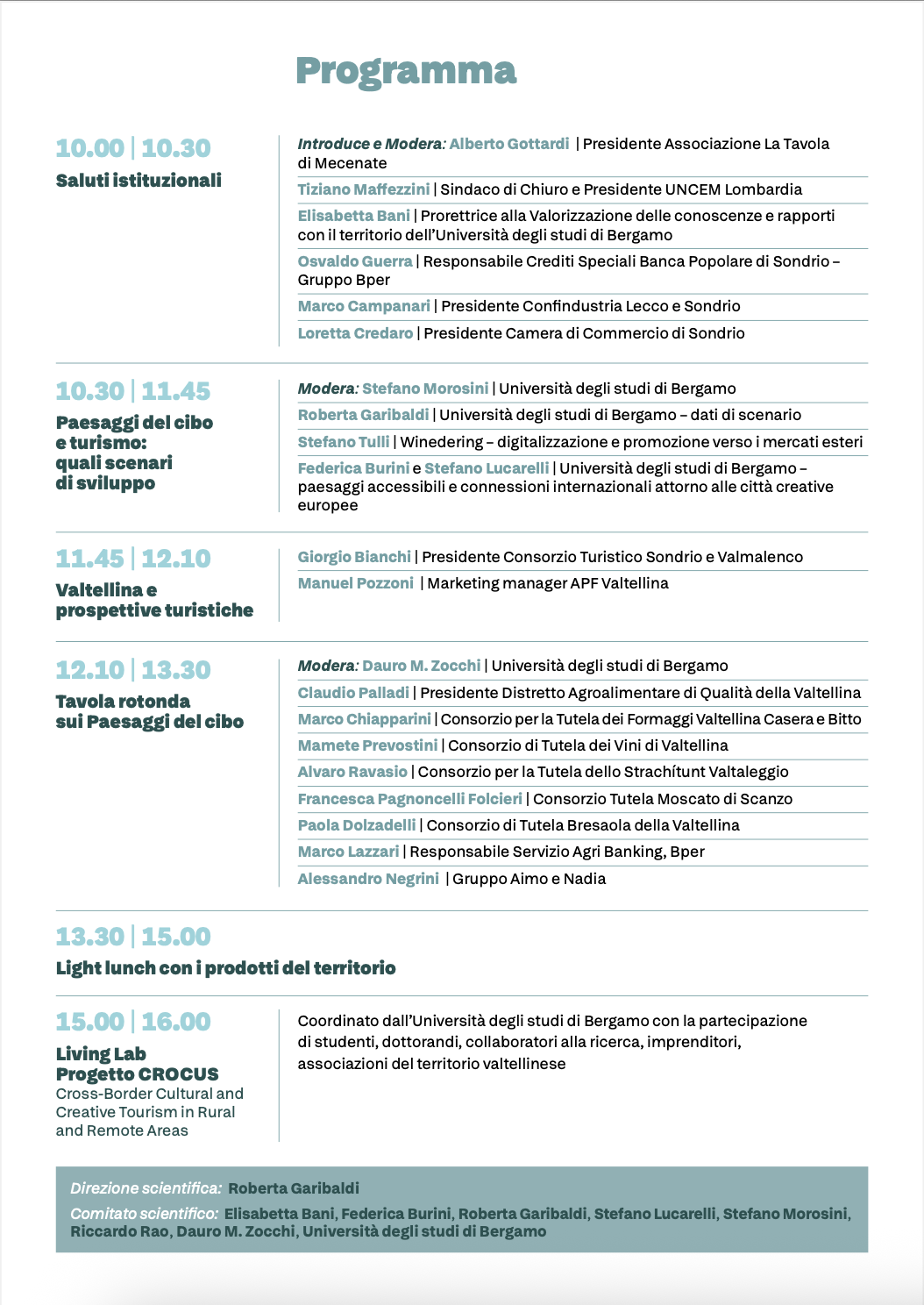 La mattinata si aprirà con gli interventi dei docenti UniBg Roberta Garibaldi, Federica Burini e Stefano Lucarelli, che approfondiranno: accessibilità dei paesaggi del cibo, sostenibilità delle produzioni, digitalizzazione della promozione turistica, reti culturali europee e città creative.