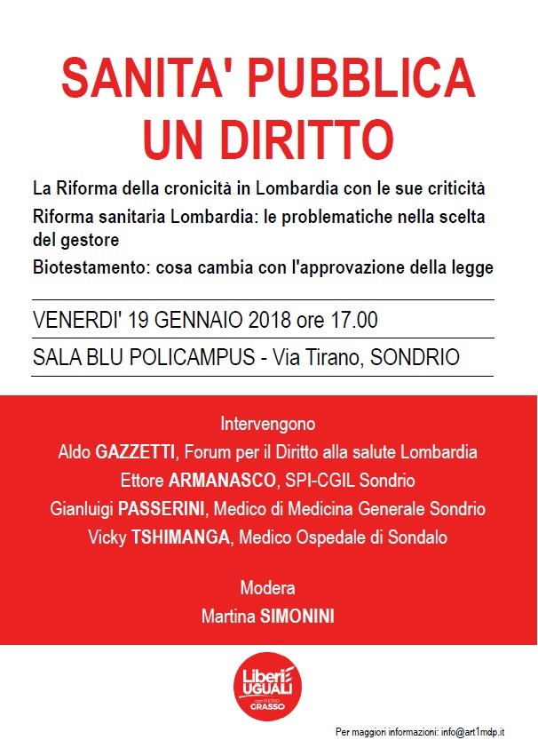 Liberi Uguali inoltre organizza per venerdì 19 gennaio alle ore 17 un incontro sulla Riforma della Cronocità in Lombardia dal titolo “Sanità pubblica Un diritto”. Interverranno Aldo Gazzetti del Forum per il Diritto alla salute Lombardia, Ettore Armanasco di SPI-CGIL Sondrio, Gianluigi Passserini, medico di Medicina Generale a Sondrio e Vicky Tshimanga, Medico dell’ospedale di Sondalo.