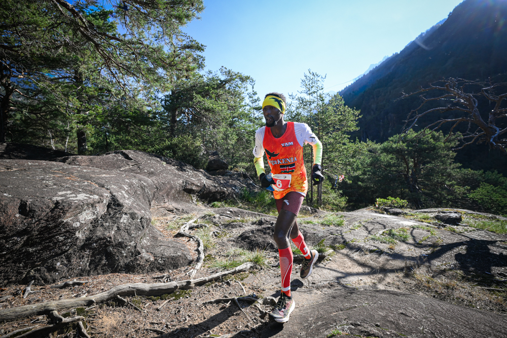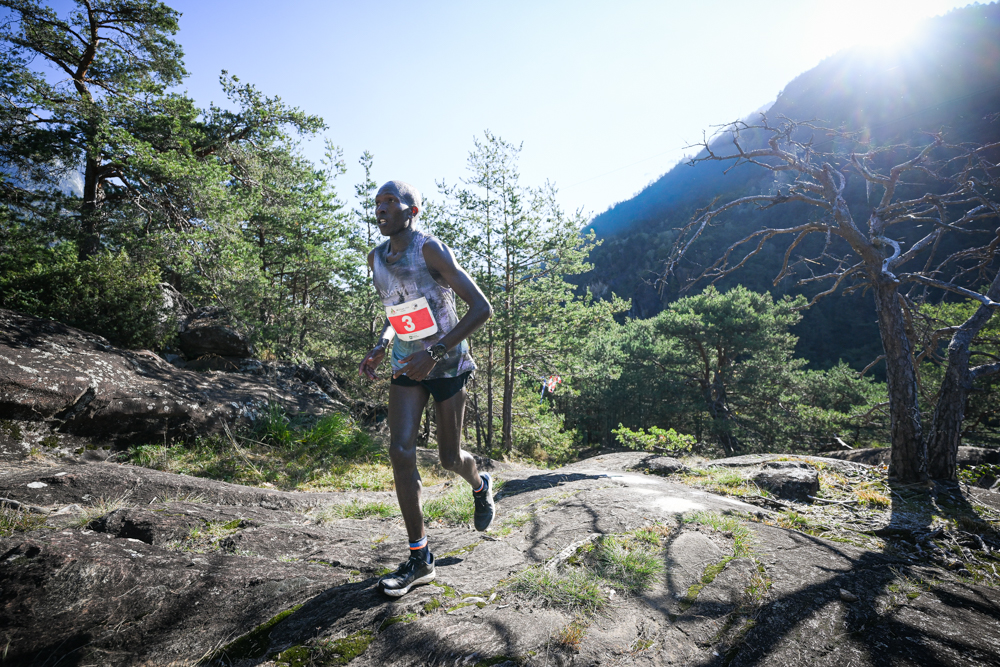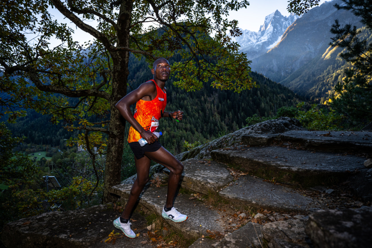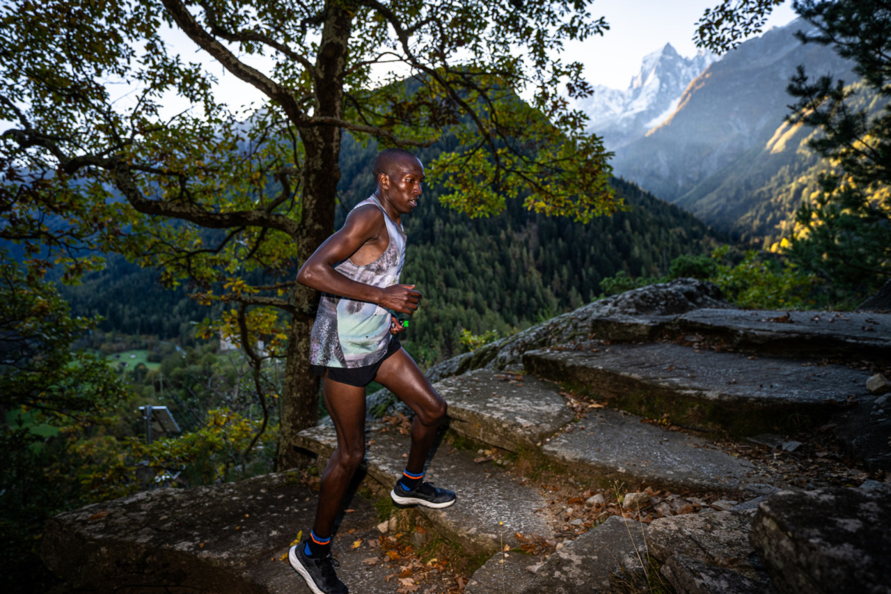 Il percorso è continuato all’interno dei boschi del castagneto secolare di Castasegna, uno dei più antichi e ampi d’Europa, dal fascino silenzioso e ricco di storie di comunità e di economia antica, dove si sentivano solo i tonfi dei passi degli atleti impegnati a correre verso Villa di Chiavenna. Luca Merli fino a questo punto in seconda posizione dietro a Lolkurraru viene oltrepassato da Abraham Ebenyo Ekwam e Kevin Kibet. Oltrepassato il confine italo-svizzero i tre keniani sempre in testa hanno affrontato l’ultima salita verso Savogno, per poi volare nella lunga discesa di dieci chilometri attraversando Crana e Sant’Abbondio. Da qui uno dei passaggi tra i più suggestivi del trail, le cascate di Acquafraggia a Borgonuovo, che con il loro spettacolare doppio salto impressionarono Leonardo da Vinci. Le loro acque bagnano il terreno e lo rendono un punto critico per gli atleti, che, proseguendo, entrano nel nuovo tratto aggiunto al percorso, con l’ingresso nel Parco delle Marmitte dei Giganti a Piuro, museo a cielo aperto di sculture naturali forgiate dai ghiacci e dalle acque. Dopo quest’ultimo tratto impegnativo, corrono verso il centro del ricco borgo storico di Chiavenna, dove li aspetta il traguardo in piazza Bertacchi. E sono loro, i tre leader keniani, sempre insieme nell’ordine di arrivo a tagliare la linea d’arrivo e ad alzare le braccia al cielo per la vittoria: Lengem Lolkurraru chiude con un tempo di 01h 43’35”, secondo con uno scarto di poco più di un minuto Abraham Ebenyo Ekwam è in 1h44’37” e terzo Kevin Kibet dell’Atletica Saluzzo con 1h46’07”.