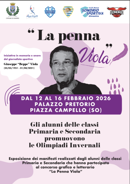 Nei giorni in cui la Valtellina è teatro naturale delle Olimpiadi Invernali 2026, a Sondrio apre la mostra dedicata ai manifesti realizzati dagli atleti-alunni delle scuole Primaria e Secondaria di primo grado che hanno partecipato al Concorso grafico e letterario “La penna Viola 2025”: gli elaborati si potranno ammirare da giovedì 12 a lunedì 16 febbraio 2026 nelle due sale espositive di Palazzo Pretorio, messe gentilmente a disposizione dal Comune di Sondrio.