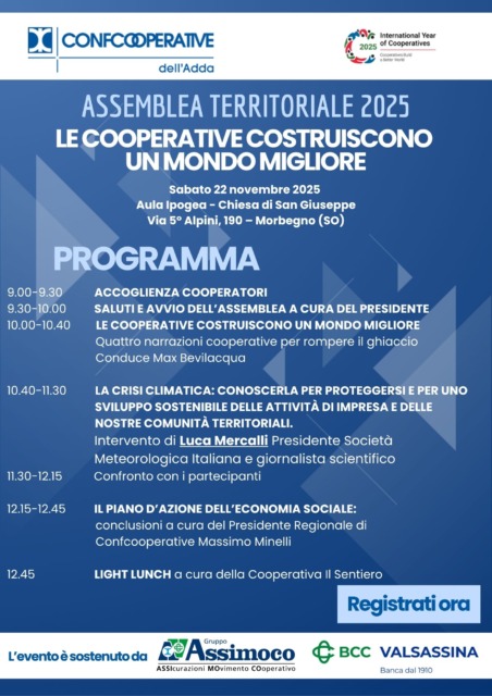Sabato 22 novembre Morbegno sarà il cuore pulsante del dibattito cooperativo territoriale. Si terrà infatti l’Assemblea di Confcooperative dell’Adda, l’organizzazione di riferimento per la cooperazione delle province di Lecco e Sondrio. Come riportato nel comunicato ufficiale, “al centro della riflessione… è il tema della tenuta e rilancio dell’Economia sociale alla luce della Transizione climatica che progressivamente sta interessando il nostro territorio”.