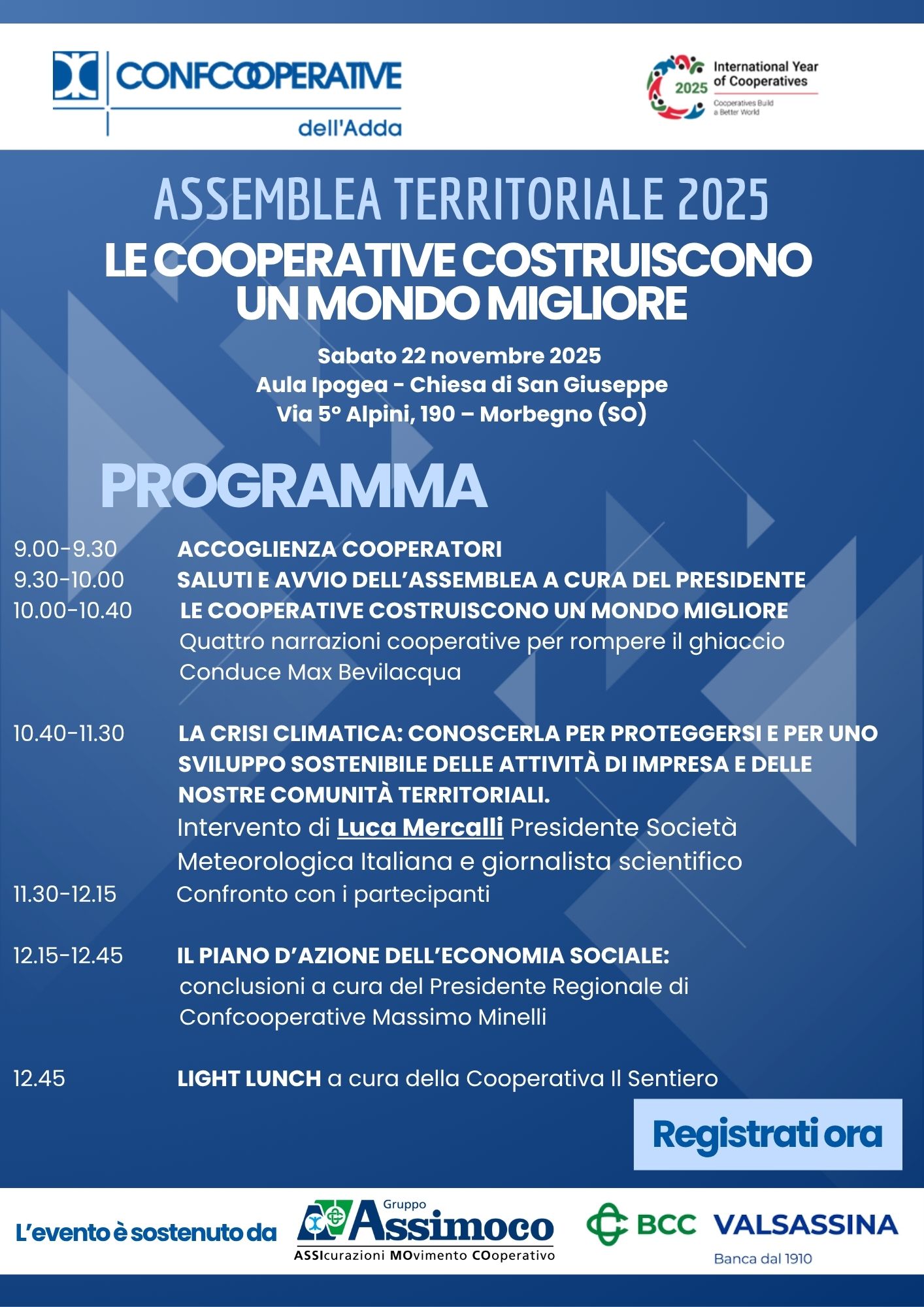 L’iniziativa si svolge nell’ambito dell’Anno Internazionale delle Cooperative (“Cooperatives build a Better World!”) e intende offrire ai dirigenti e ai soci una preziosa occasione di confronto. La stessa Confcooperative dell’Adda sottolinea come sia stato ritenuto strategico mettere a disposizione “uno spazio di confronto e approfondimento” su due questioni decisive: l’imminente approvazione del Piano Nazionale dell’Economia Sociale e l’impatto crescente della crisi climatica sulle imprese cooperative e sulle comunità locali.
